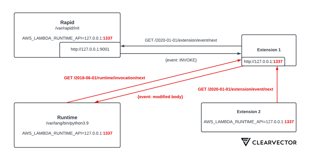 By changing the AWS_LAMBDA_RUNTIME_API environment variable to a port we have access to, it's possible to intercept all actions within the Lambda runtime (man-in-the-middle). This is possible because the extension runs with the same privileges as Rapid Init, and the system's kernel allows for modification of process memory, enabling the alteration of the port number.