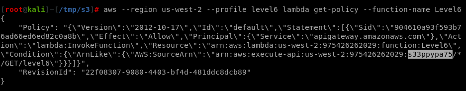 aws --region us-west-2 --profile level6 lambda get-policy --function-name Level6