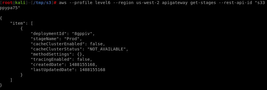 aws --profile level6 --region us-west-2 apigateway get-stages --rest-api-id "s33ppypa75"