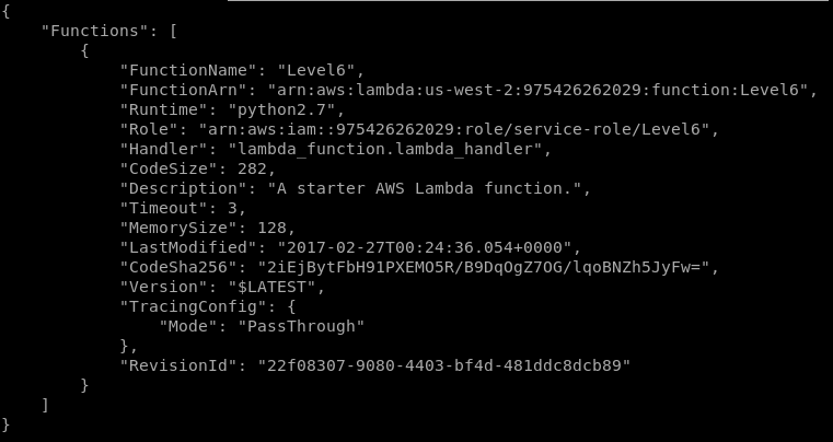And finally call the function accessing (notice that the ID, Name and function-name appears in the URL): https://s33ppypa75.execute-api.us-west-2.amazonaws.com/Prod/level6