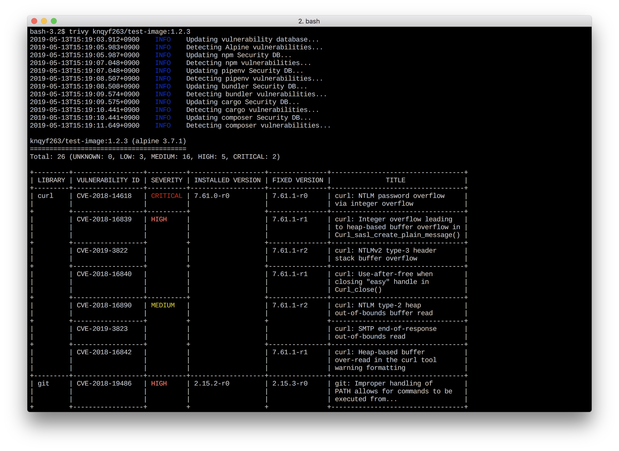 Trivy is easy to use. Just install the binary and you're ready to scan. All you need to do for scanning is to specify a target such as an image name of the container.